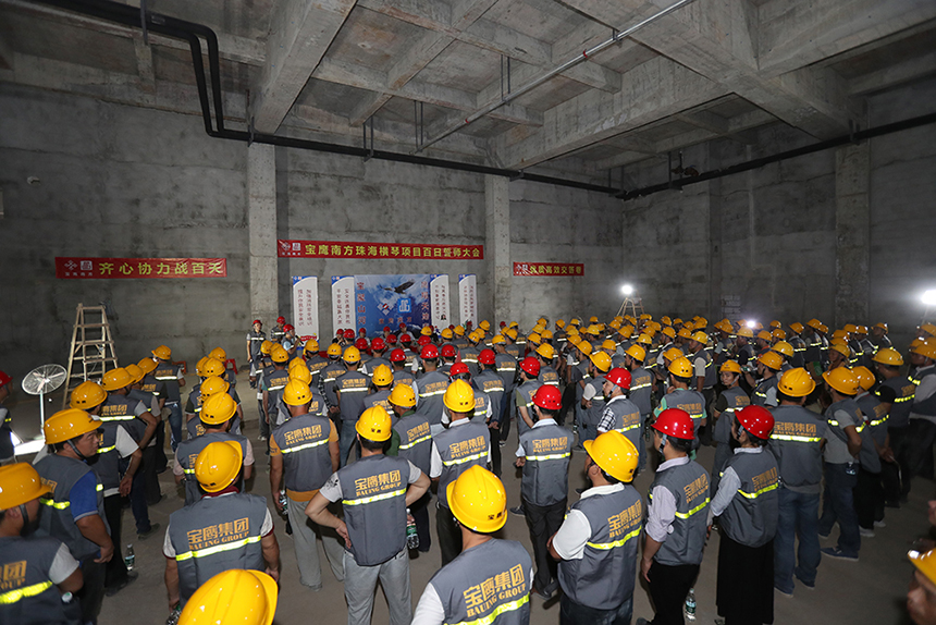 珠海橫琴星藝文創(chuàng)天地項(xiàng)目工序多、工程量大,存在著多工種、多工序的交叉作業(yè),對施工形成極大的考驗(yàn)。早在項(xiàng)目招標(biāo)時,甲方就對工程進(jìn)度和質(zhì)量提出了嚴(yán)格要求:施工單位必須嚴(yán)格遵守甲方提出的各項(xiàng)質(zhì)量標(biāo)準(zhǔn),且必須在八月初保質(zhì)保量完成。針對這一現(xiàn)實(shí)情況,寶鷹集團(tuán)立即組建保質(zhì)量、保工期工作小組,積極部署項(xiàng)目建設(shè),并召開此次安全培訓(xùn)暨百日攻堅(jiān)誓師大會,以保障項(xiàng)目如期高質(zhì)量完工。