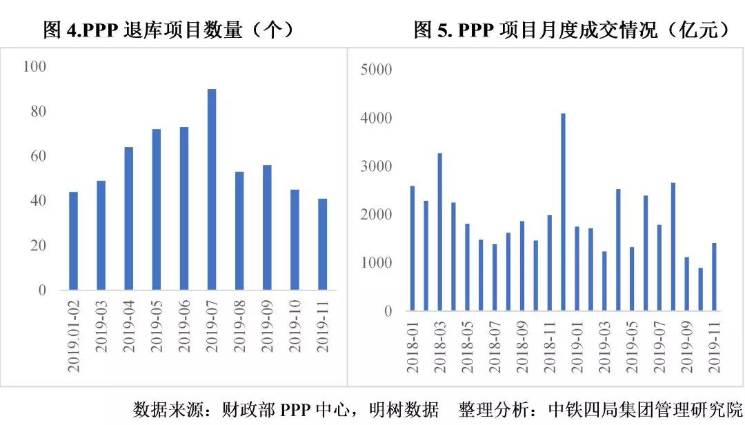 3.PPP延續(xù)高質(zhì)量發(fā)展。從財政部PPP項目管理庫入庫情況看,2019年1-11月,管理庫凈入庫項目745個,投資額1.1萬億元。凈增項目數(shù)量和投資額均不足2018年同期的50%,但 落地率和開工率明顯提升。截至2019年11月,管理庫項目落地率為66.1%,較2018年底提升11.9個百分點;開工率達(dá)58.2%,較2018年底提升10.5個百分點。2019年下半年以來,PPP項目退庫情況較上半年有明顯減輕趨勢。前述情況表明,PPP項目質(zhì)量不斷提升。見圖4、圖5。