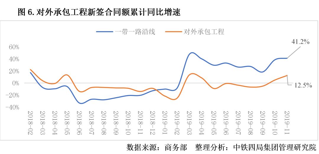 4.對外承包工程市場緩慢復(fù)蘇。2019年1-11月,我國對外承包工程累計完成新簽合同額2085.2億美元,實現(xiàn)營業(yè)額1349.7億美元,分別為2018年全年的86.2%、79.8%。對外承包工程市場下半年緩慢復(fù)蘇,截至11月新簽合同額同比增速提升至12.5%;營業(yè)額同比增速自5月起持續(xù)走低,截至11月增速為-2.2%?!耙粠б宦贰毖鼐€國家表現(xiàn)良好,2019年前11個月累計新簽合同額同比增速達(dá)41.2%,占對外承包工程比重高達(dá)61.2%,占比持續(xù)上升。見圖6。