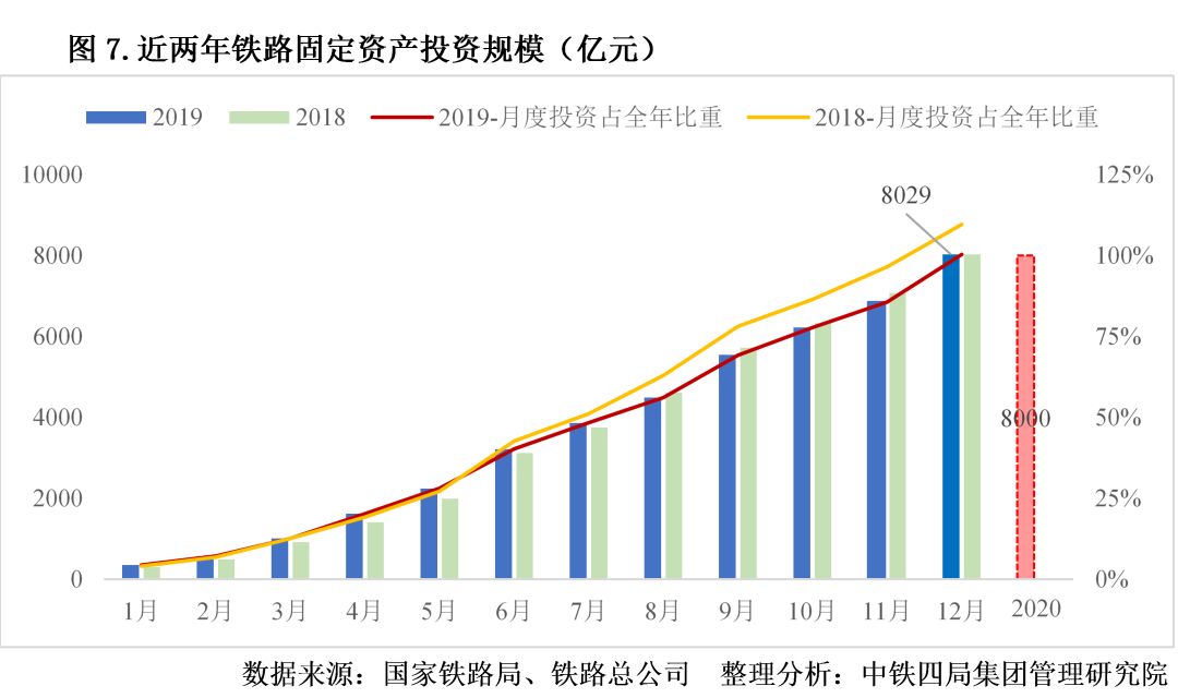 1.鐵路建設(shè)投資保持穩(wěn)定。2019年,全國鐵路固定資產(chǎn)計劃投資8000億元,實際完成8029億元,與2018年投資完成額(8028億元)持平,完成計劃投資額的100.36%,鐵路固定資產(chǎn)投資總體表現(xiàn)平穩(wěn)。根據(jù)2020年全國交通運(yùn)輸工作會議精神,2020年全國鐵路固定資產(chǎn)投資計劃完成8000億元。見圖7。