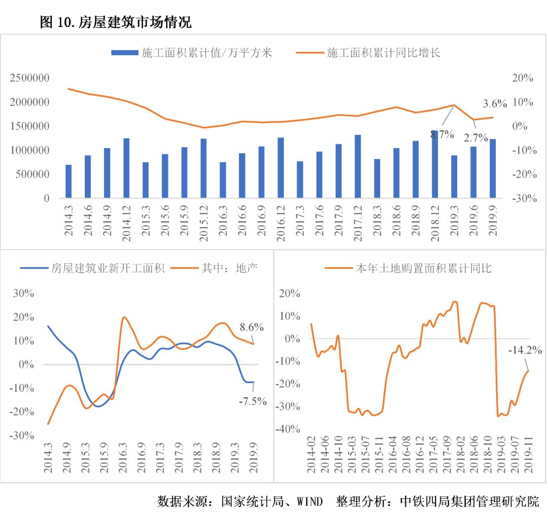 5.房屋建筑市場趨于穩(wěn)定。2019年,房屋建筑施工面積在波動中保持增長態(tài)勢。房建施工面積的穩(wěn)定與房地產(chǎn)市場的韌勁足有很大關(guān)系,前三季度房地產(chǎn)施工面積累計同比增速為10%。房地產(chǎn)市場的穩(wěn)健發(fā)展得力于因城施策的進(jìn)一步深化,各地政府堅持實施定向微調(diào)、保障合理住房需求,行業(yè)運(yùn)行制度更趨完善,一定程度上保障了房地產(chǎn)市場的穩(wěn)定。2019年前三個季度,房屋建筑業(yè)新開工面積增速為-7.5%,已連續(xù)兩個季度為負(fù)增長。其中,地產(chǎn)類新開工面積增速為8.6%,表明除地產(chǎn)以外的其他房建新開工情況堪憂(如公共場館、工業(yè)廠房建筑等)。從地產(chǎn)類土地購置面積來看,2019年累計同比增速持續(xù)為負(fù),后續(xù)可能影響到房地產(chǎn)新開工面積和施工面積的增長。見圖10。
