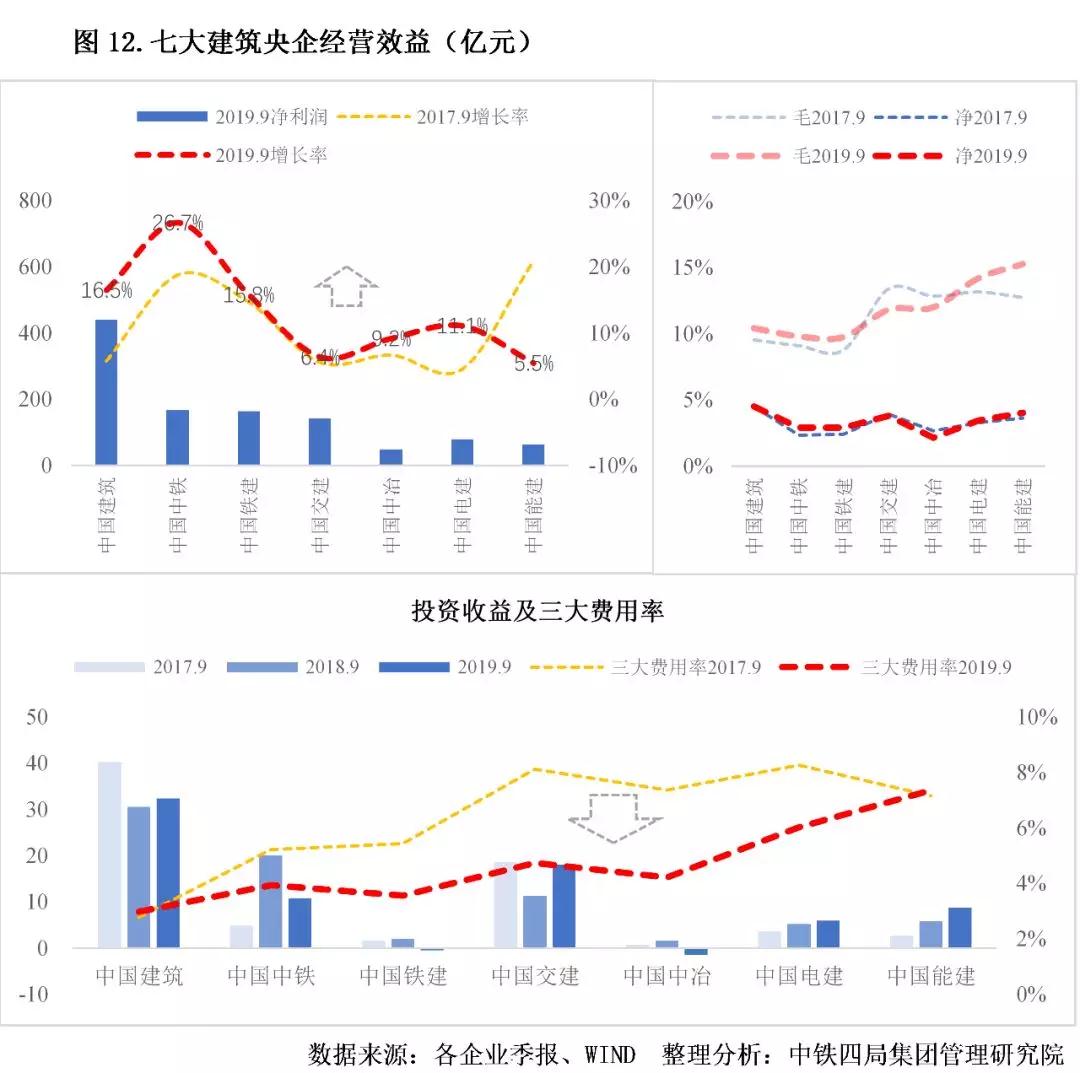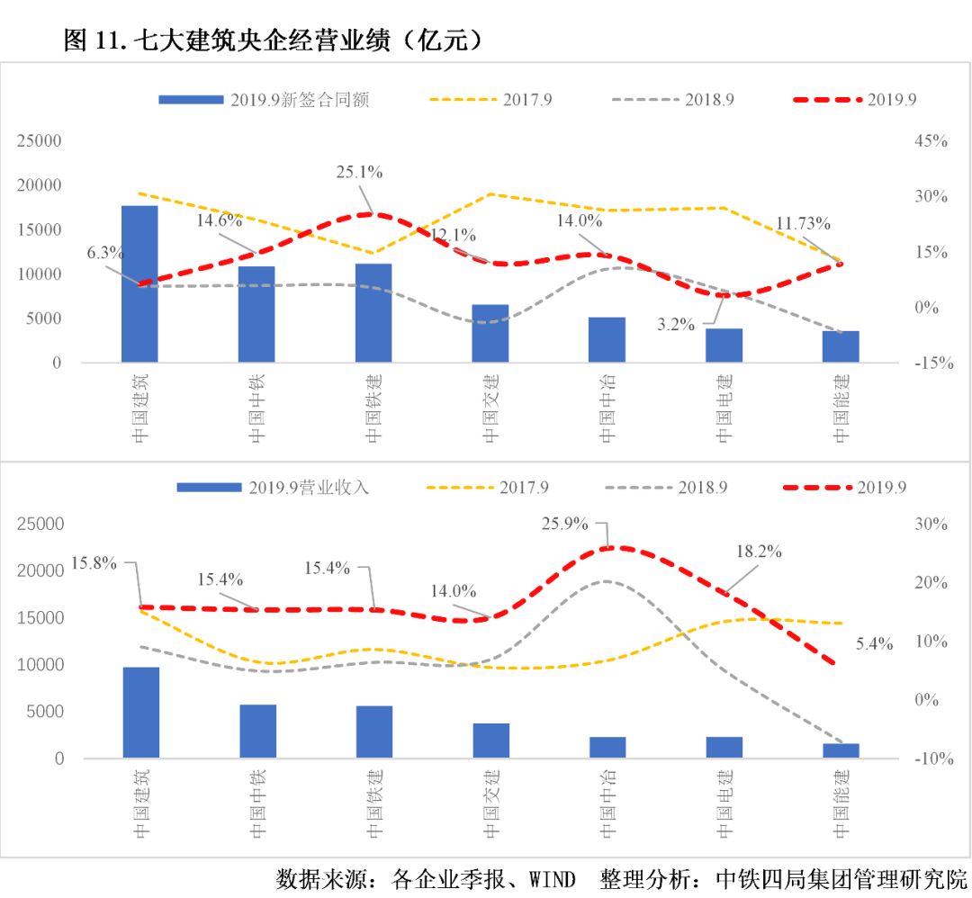 1.經(jīng)營業(yè)績增速回升。2019年前三季度,七大建筑央企新簽合同額、營業(yè)收入增速較上年明顯提升,增速多在兩位數(shù)以上,明顯高于同期全國建筑業(yè)新簽合同額增速(4.38%)、總產(chǎn)值增速(6.7%)。由此可見,建筑央企的市場拓展能力和逆周期調(diào)節(jié)能力較強(qiáng),建筑央企訂單加速增長,行業(yè)集中度持續(xù)提升。見圖11。