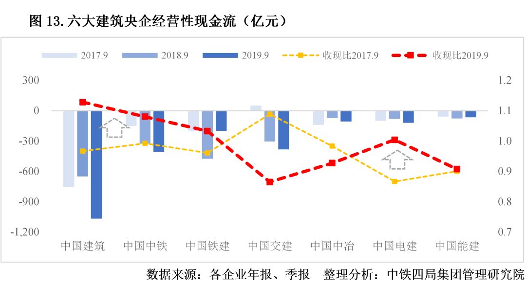 3.央企收現(xiàn)比明顯改善。從收現(xiàn)比(銷售商品、提供勞務(wù)收到的現(xiàn)金/營業(yè)收入)來看,近三年來,除中國交建、中國中冶、中國能建外,其他建筑央企收現(xiàn)比明顯改善。從現(xiàn)金流來看,工程施工企業(yè)的商業(yè)模式往往為前三季度現(xiàn)金凈支出,第四季度現(xiàn)金凈回流。近三年,各大建筑央企前三季度的經(jīng)營性現(xiàn)金流普遍為負(fù)值,其中,中國建筑、中國中鐵、中國交建、中國電建2019年的現(xiàn)金凈流量負(fù)值進(jìn)一步擴(kuò)大。見圖13。