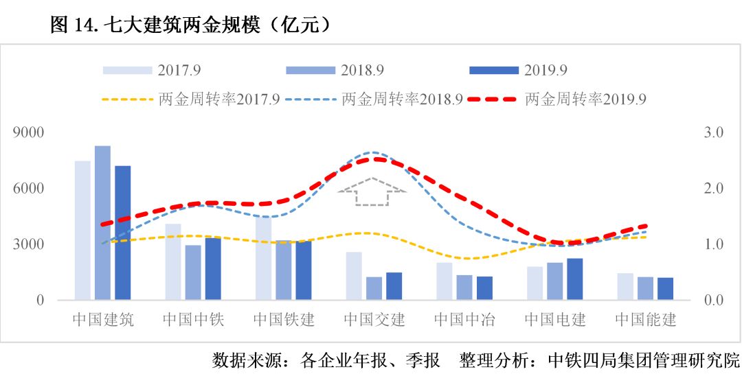 4.壓降“兩金”效果逐漸顯現(xiàn)。建筑業(yè)供給側(cè)改革背景下,建筑央企積極壓降“兩金”,效果初步顯現(xiàn)。2017年以來,各大建筑央企“兩金”周轉(zhuǎn)率結(jié)束下降趨勢,從2018年開始提升。從“兩金”規(guī)模來看,除中國電建外,其他建筑央企“兩金”總額都有所降低;從相對值來看,除中國電建和中國能建“兩金”周轉(zhuǎn)率變動不明顯外,其他建筑央企“兩金”周轉(zhuǎn)率都有明顯提升,其中中國交建提升幅度最大。見圖14。
