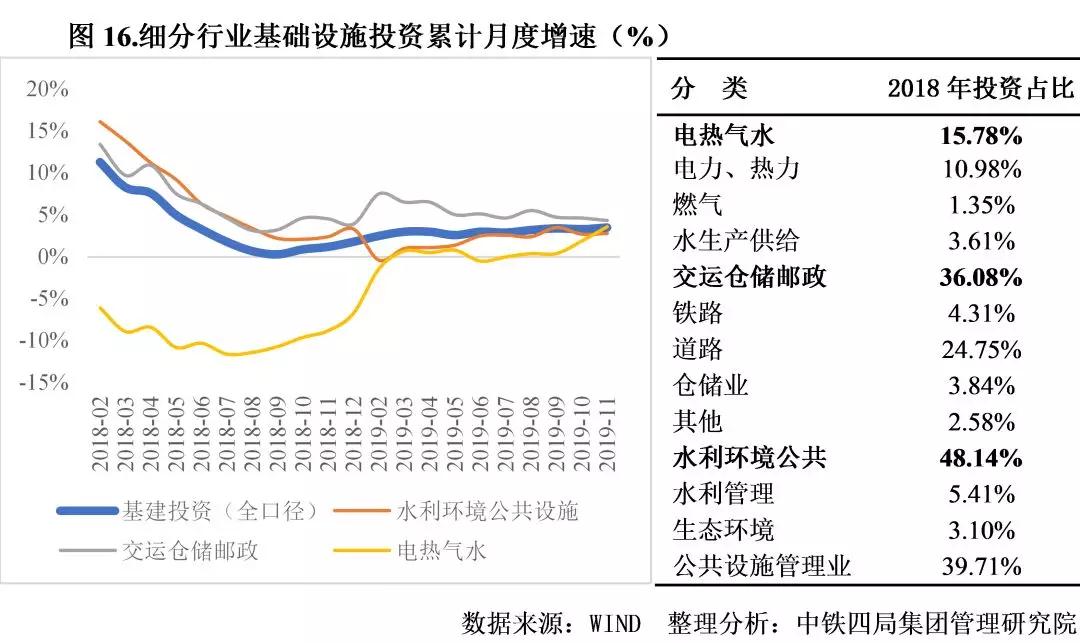 一是基建投資溫和回暖。隨著基建補(bǔ)短板政策陸續(xù)出臺,基建投資增速觸底反彈,自2018年9月起保持弱復(fù)蘇態(tài)勢。2019年12月中央經(jīng)濟(jì)工作會議明確要求堅持穩(wěn)字當(dāng)頭,預(yù)計宏觀經(jīng)濟(jì)政策逆周期調(diào)節(jié)下,基建將繼續(xù)發(fā)力。2019年9月國家提前下達(dá)部分2020年新增專項債限額1萬億元,且明確規(guī)定不得用于土地儲備和房地產(chǎn)相關(guān)領(lǐng)域,全年投向基建的專項債占比有望提高至60%,疊加項目最低資本金比例由25%下調(diào)為20%,專項債可作資本金參與項目投資等規(guī)定,基建投資增速將得到提升。交通和市政仍是核心發(fā)力點。2019年道路、鐵路、公路運(yùn)輸建設(shè)投資的增長促進(jìn)了基建投資的復(fù)蘇,下半年國家發(fā)布《西部陸海新通道總體規(guī)劃》《交通強(qiáng)國建設(shè)綱要》等重大政策,預(yù)計2020年交通運(yùn)輸投資建設(shè)仍將是重點。公共設(shè)施管理業(yè)占基建投資的比重達(dá)40%,中央經(jīng)濟(jì)工作會議明確提出將引導(dǎo)資金投向供需共同受益的民生建設(shè)等短板領(lǐng)域,加強(qiáng)市政管網(wǎng)、城市停車場、冷鏈物流的建設(shè),預(yù)計2020年該領(lǐng)域投資將迎來新機(jī)遇。見圖16。