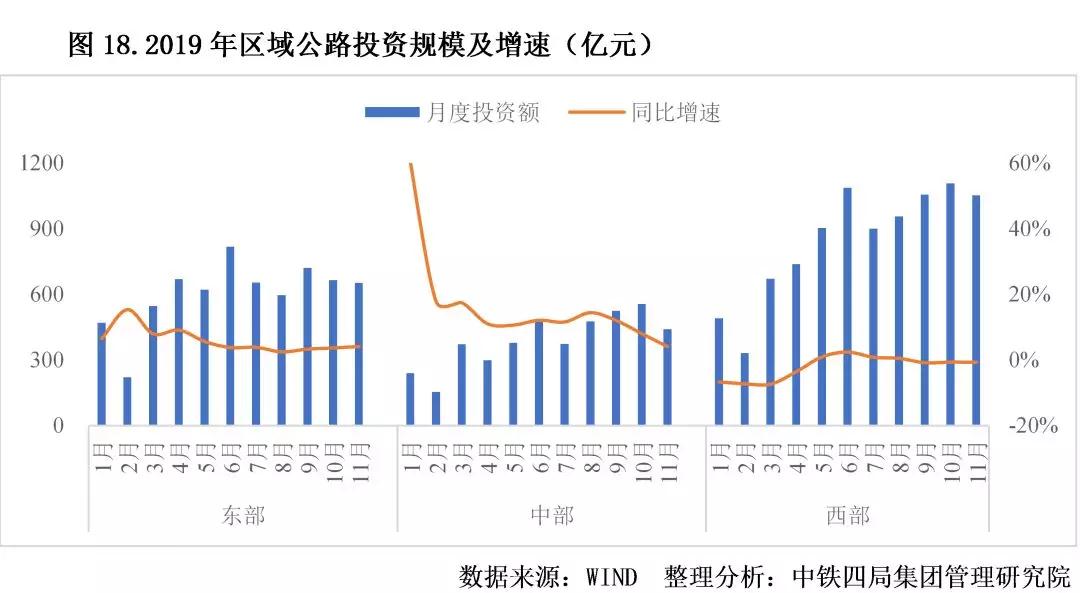 公路建設(shè)投資區(qū)域差距逐漸縮小。2019年我國公路建設(shè)區(qū)域投資格局保持不變,中部地區(qū)與東、西部地區(qū)差距進(jìn)一步縮小。從投資規(guī)模來看,西部最高、東部次之,中部較低。從投資增速來看,中部地區(qū)公路投資從年初開始發(fā)力,以60.4%的增速開啟2019年的趕超步伐,2019年11個月平均增速達(dá)到16.4%;東部地區(qū)為6.0%、西部地區(qū)為-2.0%。2020年,中部地區(qū)或?qū)⑦M(jìn)一步加大投資力度。見圖18。