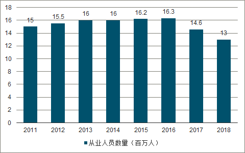 而從業(yè)人員總量由2005年的1100萬人增加到2016年的1630萬人;2017年,行業(yè)從業(yè)人員數(shù)量開始下降,截至2018年底,全行業(yè)就業(yè)人口達1300萬人以上。