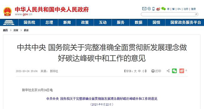 中共中央國務(wù)院關(guān)于完整準(zhǔn)確全面貫徹新發(fā)展理念做好碳達(dá)峰碳中和工作的意見
