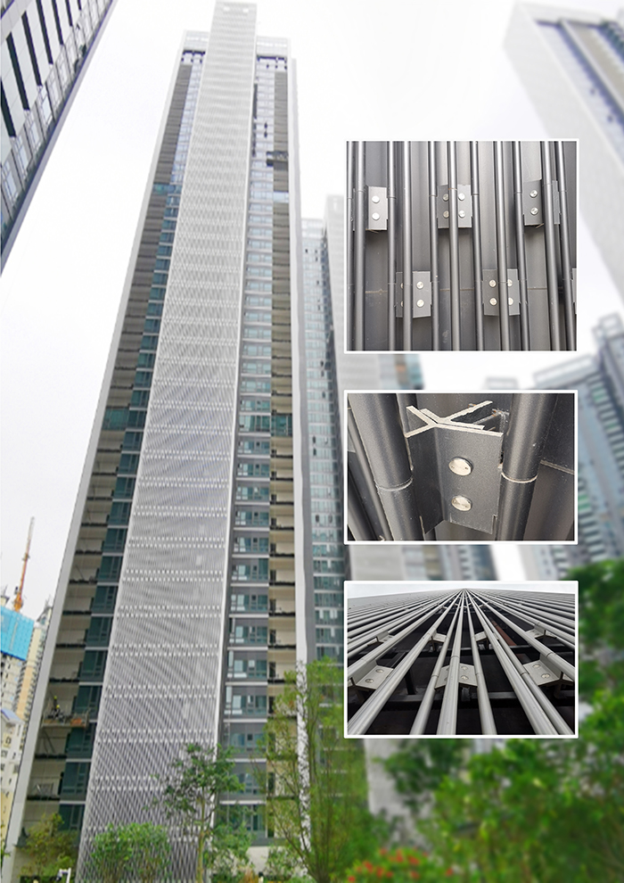 為了解決扁管形、方管形等傳統(tǒng)格柵幕墻施工的安裝技術(shù)難題,寶鷹集團(tuán)通過項目施工安裝實踐,積累豐富的實踐經(jīng)驗,取得了“圓管格柵幕墻施工技術(shù)”的研究成果。圓管格柵幕墻施工技術(shù)是在鋁板幕墻系統(tǒng)的基礎(chǔ)上外加圓管格柵系統(tǒng)組成的一種幕墻形式。該技術(shù)已在多個項目成功運(yùn)用,并取得了較好的社會效益和經(jīng)濟(jì)效益。