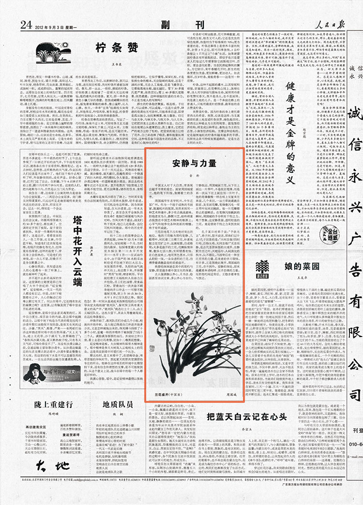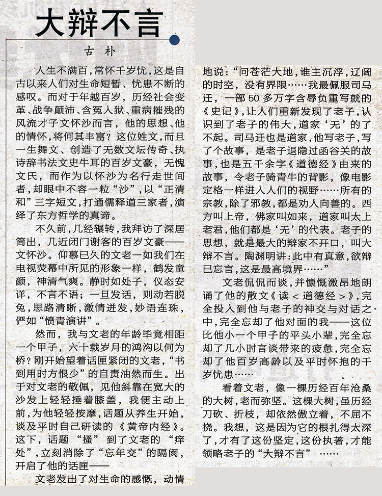 文章《安靜與力量》刊登在 9 月 3 日的《人民日報》副刊,文章《大辯不言》刊登在 9 月 9 日的《渤海早報》副刊。兩篇文章分別是古樸先生對文化名人周國城先生、文懷沙先生及其相關作品和思想的見解與感受。文章樸實、自然,文風純正,語言簡潔、明快,主旨明確、暢達,充分闡述了自己對中國文化的見解,表達了對中國傳統(tǒng)文化的熱愛以及對文懷沙、周國城等文化大師的崇敬。我國著名的國學大師文懷沙老先生讀完文章后親筆評價到“陶令欲辯忘言,古樸每落言詮,俱登妙諦也。”