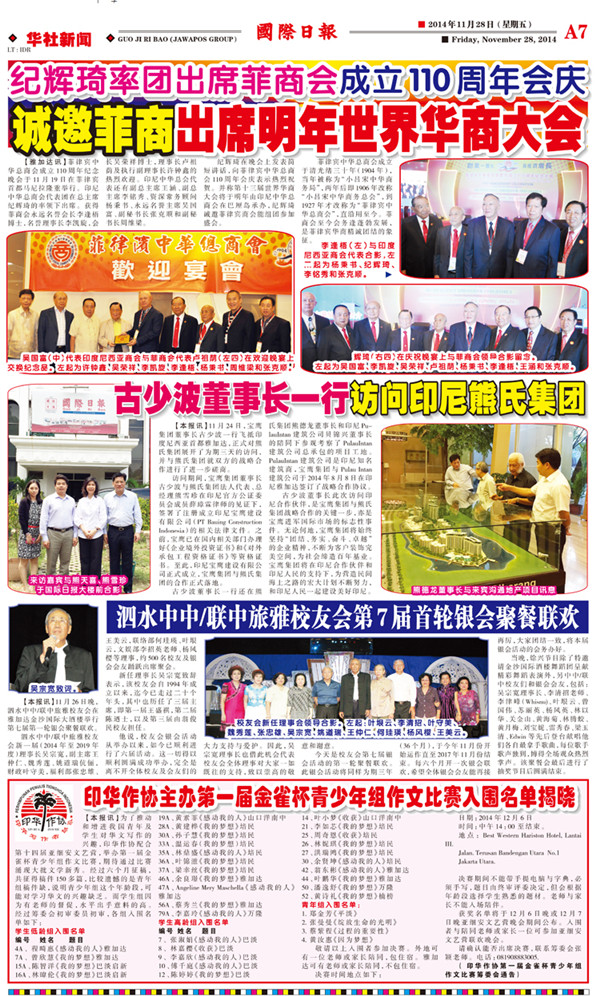 印尼《國(guó)際日?qǐng)?bào)》于2014年11月28日A7版刊發(fā)了《古少波董事長(zhǎng)一行訪問印尼熊氏集團(tuán)》一文,現(xiàn)本網(wǎng)予以轉(zhuǎn)載。