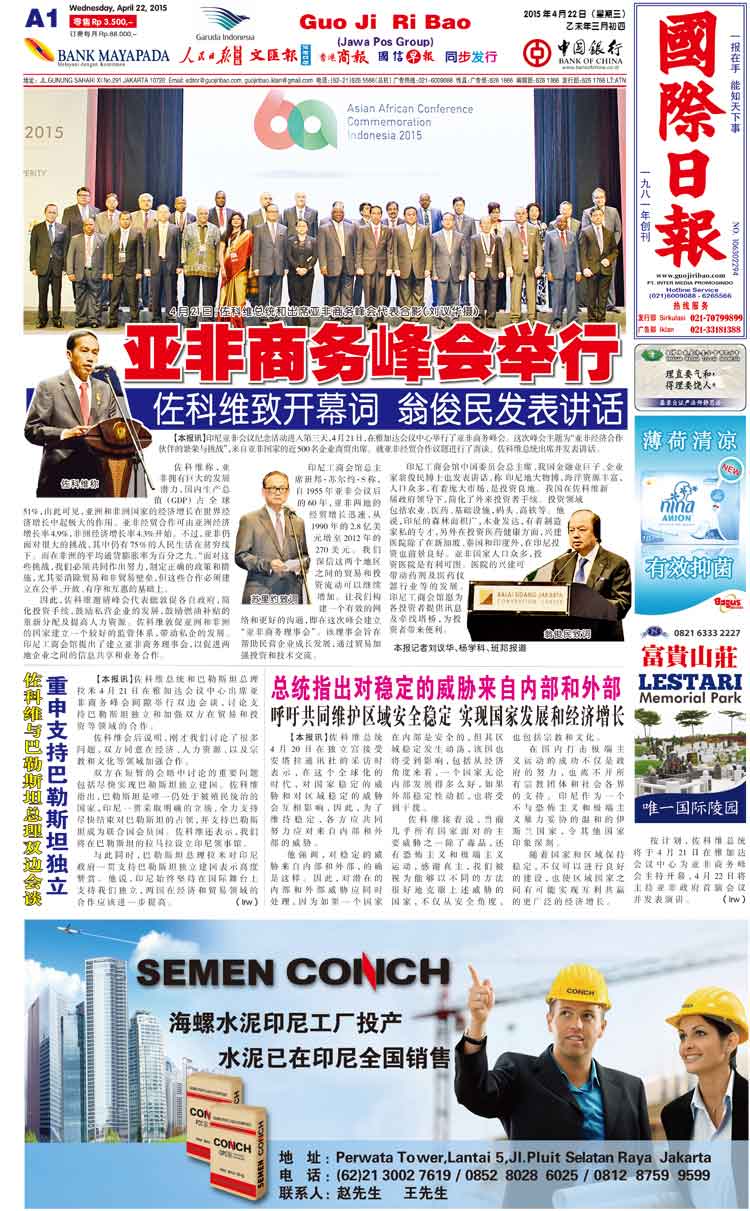 4月21日,亞非商業(yè)峰會在雅加達舉行,寶鷹集團董事局主席古少明以亞洲企業(yè)商賈身份應(yīng)邀出席。4月22日,《國際日報》刊登了峰會報道,并在A8版特別報道了峰會上印尼工商會館和中國貿(mào)促會簽署合作協(xié)議事宜。引人注目的是,《國際日報》還以“中國寶鷹集團董事局古少明應(yīng)邀參加亞非商業(yè)峰會”為題,特別報道了“一帶一路”政策背景下寶鷹集團在印尼的戰(zhàn)略布局。現(xiàn)本網(wǎng)予以轉(zhuǎn)載。