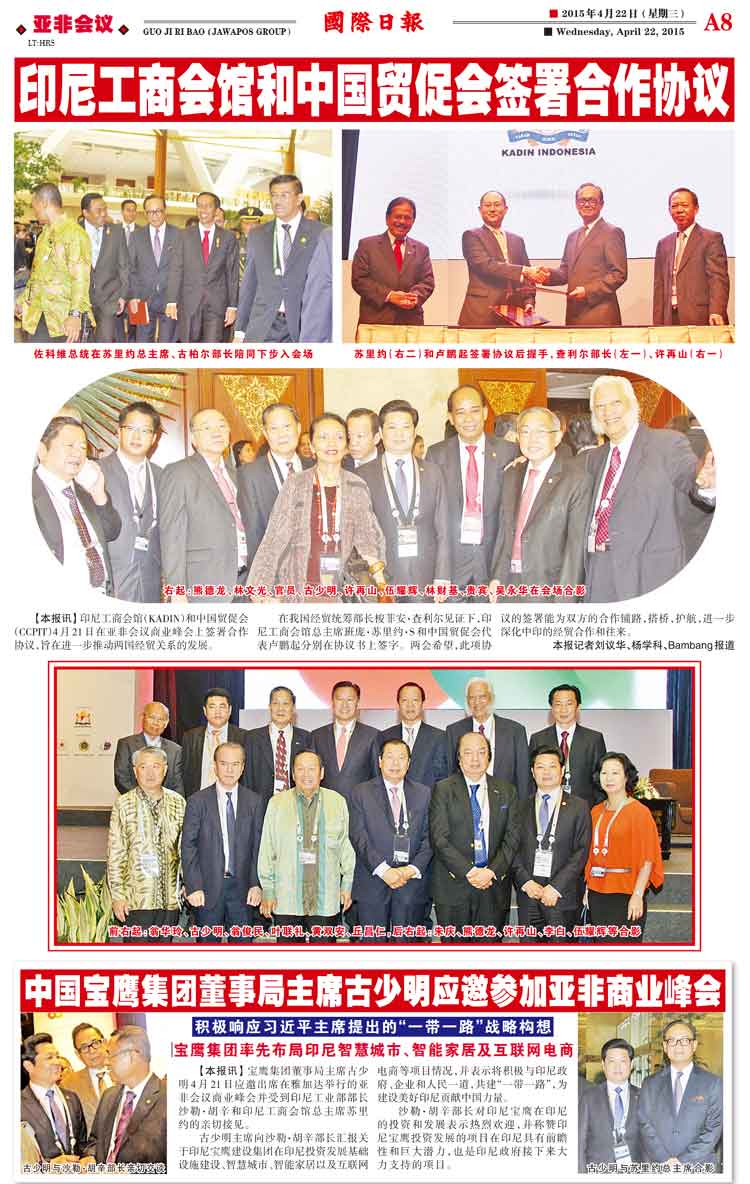 《國際日報》以“中國寶鷹集團董事局古少明應(yīng)邀參加亞非商業(yè)峰會”為題,特別報道了“一帶一路”政策背景下寶鷹集團在印尼的戰(zhàn)略布局。