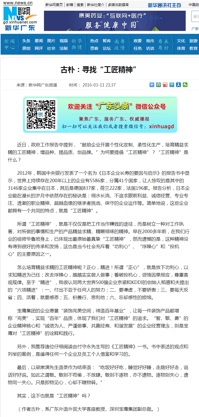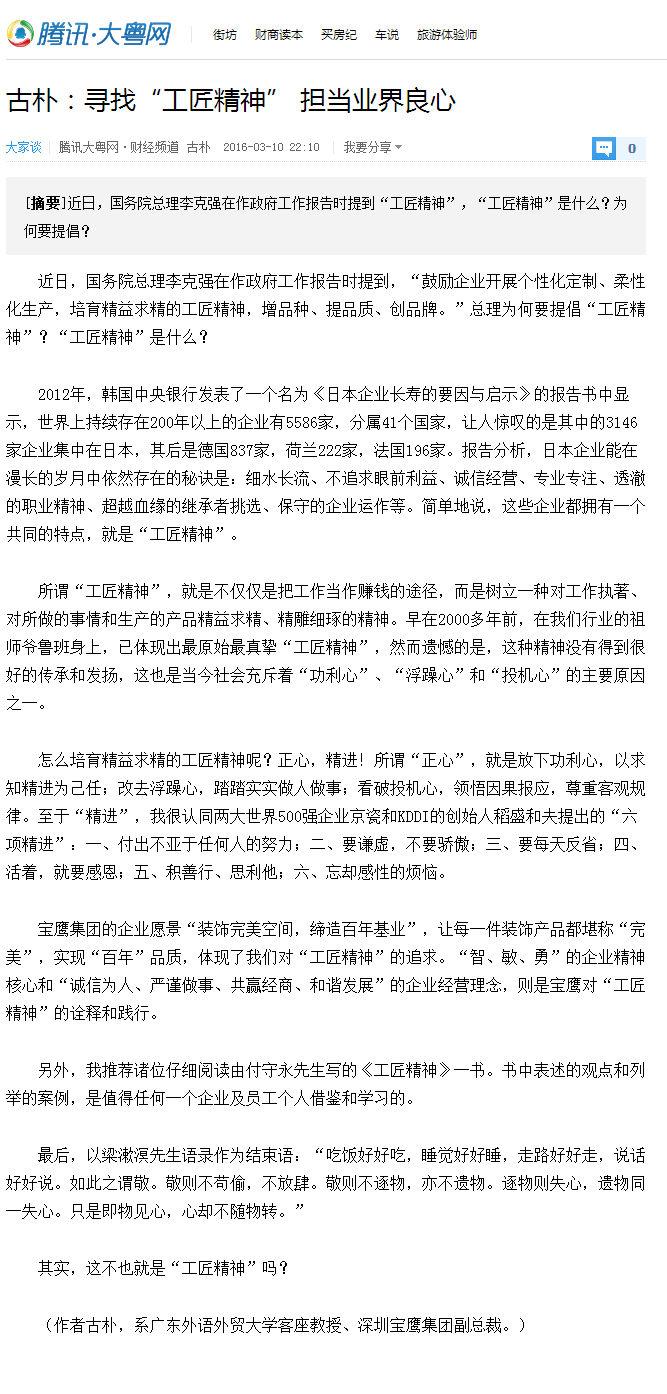 近日,國務院總理李克強在作政府工作報告時提到“工匠精神”,“工匠精神”是什么?為何要提倡?騰訊網、鳳凰網、新華網等國內多家媒體刊登寶鷹集團副總裁文章《尋找“工匠精神”》,且看古樸先生如何解讀。