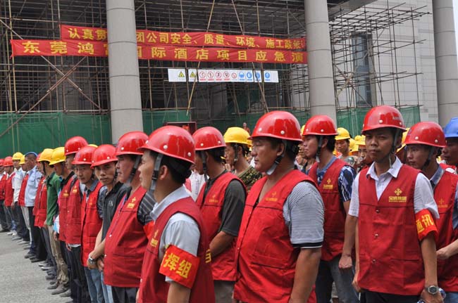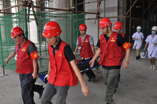 為加強(qiáng)在建工地的安全管理,增強(qiáng)工人的安全意識,提高對建筑施工現(xiàn)場突發(fā)事故的實(shí)戰(zhàn)能力,檢驗(yàn)公司安全生產(chǎn)事故應(yīng)急救援預(yù)案合理性與可行性。8月19日上午,由集團(tuán)質(zhì)量安全部與工程管理中心工程四部聯(lián)合組織的建筑施工現(xiàn)場應(yīng)急演練在指定項(xiàng)目工地舉行,集團(tuán)常務(wù)副總裁許平參加了演練現(xiàn)場觀摩,200多名施工人員人與工程業(yè)主方相關(guān)人員配合參加了此次演練。