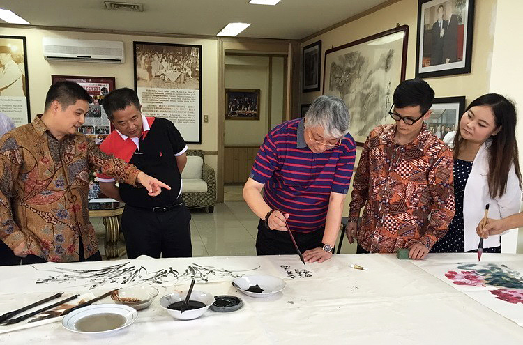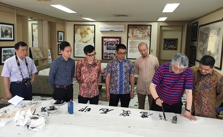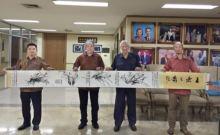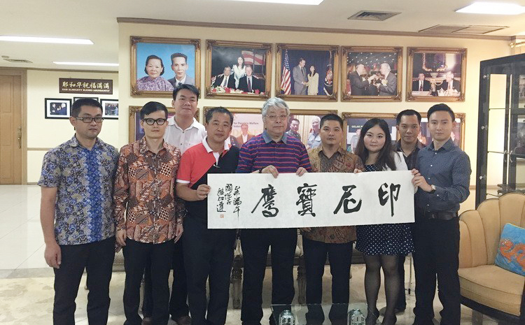 6月22日,周國(guó)城主席在古樸副總裁和印尼寶鷹工作人員的見(jiàn)證下,為印尼寶鷹題字,一起祝福印尼寶鷹事業(yè)飛黃騰達(dá)。6月23日,印尼INTILAND地產(chǎn)集團(tuán)董事長(zhǎng)吳端華設(shè)宴接待了周國(guó)城主席和古樸副總裁一行,暢敘了與寶鷹的合作情誼。周國(guó)城主席在宴席上向吳端華董事長(zhǎng)贈(zèng)送了自己的手卷作品。之后,周國(guó)城主席和古樸副總裁在熊德龍董事長(zhǎng)和吳端華董事長(zhǎng)的陪同下,拜訪了印尼國(guó)家安全部部長(zhǎng)Stiyoso,并贈(zèng)送了周國(guó)城主席的手卷作品。