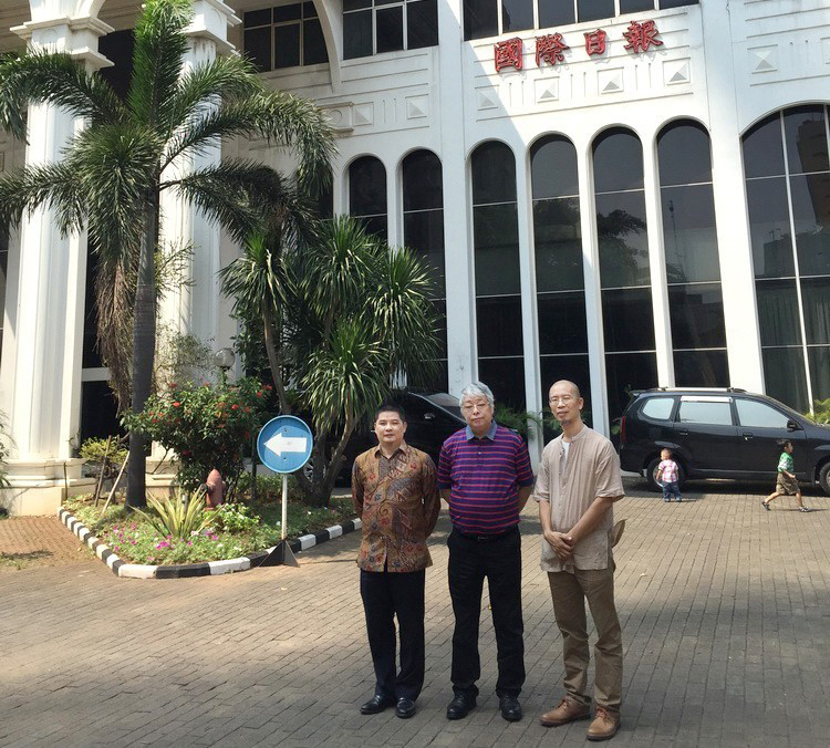 周國(guó)城主席(中)與古樸副總裁(左)、劉思東副主席(右)在印尼寶鷹總部——國(guó)際日?qǐng)?bào)大樓前