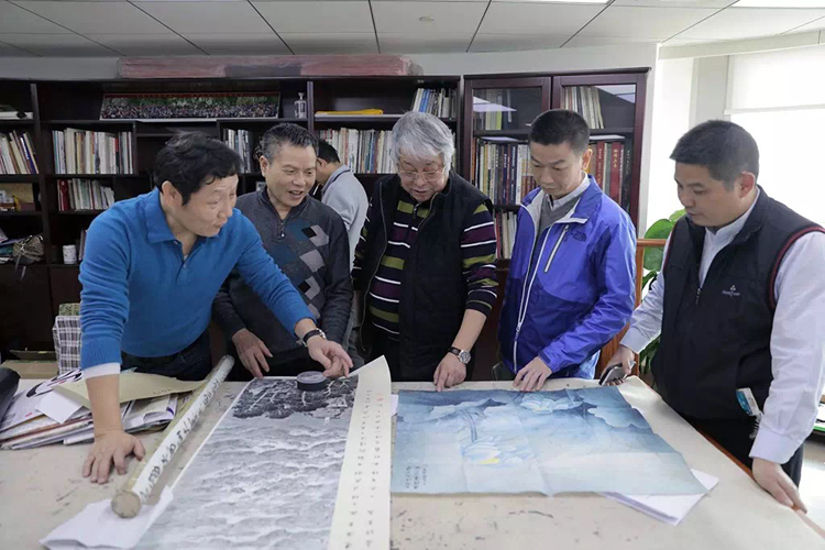 ▲各位評(píng)委探討參賽畫作