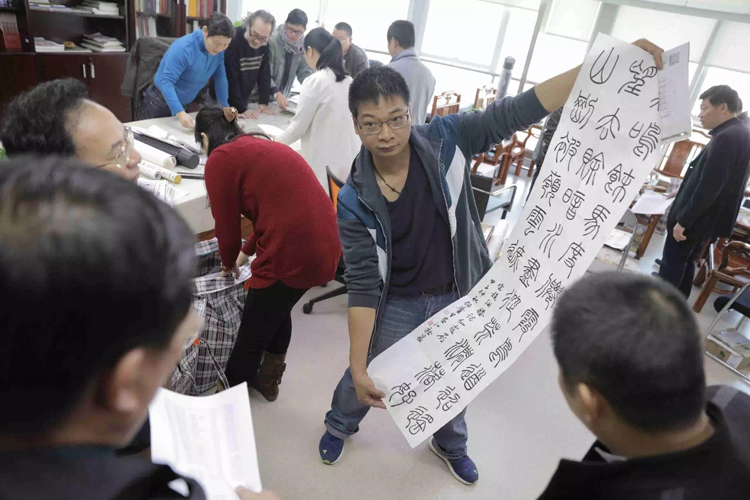 ▲各位評(píng)委評(píng)比參賽書法作品