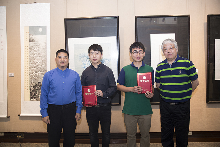西泠印社社員、廣東華人書法院名譽(yù)院長(zhǎng)郭莽園先生,寶鷹集團(tuán)監(jiān)事會(huì)主席胡蘭萍與廣東廣播電視臺(tái)珠江頻道總編輯陳光文為榮獲國(guó)畫類三等獎(jiǎng)的黃詠茵、譚禮、黃毅成頒獎(jiǎng)。