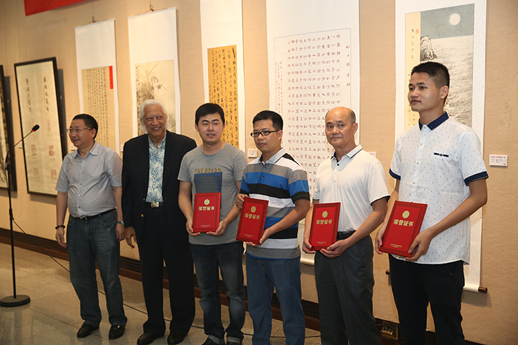 《國(guó)際日?qǐng)?bào)》董事長(zhǎng)熊德龍,國(guó)家文物進(jìn)出境責(zé)任鑒定員、廣東省文物鑒定委員會(huì)委員潘鳴皋,廣東省嶺南文化藝術(shù)促進(jìn)基金會(huì)書畫藝委會(huì)主任,廣州市藝術(shù)品行業(yè)商會(huì)常務(wù)副會(huì)長(zhǎng)兼書畫藝委會(huì)主任嚴(yán)君云,中國(guó)書法家協(xié)會(huì)香港分會(huì)執(zhí)行委員會(huì)副主席、《香港書畫報(bào)》總編輯、《香港書法》雜志主編范淳奇,廣東廣播電視臺(tái)珠江頻道總監(jiān)林建平為榮獲書法類三等獎(jiǎng)的張倩、何溉華、朱定榮、黎志源、曹端陽(yáng)五位頒獎(jiǎng)。