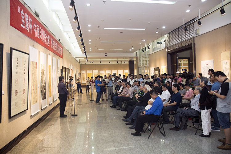 頒獎(jiǎng)禮由廣東廣播電視臺(tái)主持人伍燕主持。原廣東廣播電視總臺(tái)副臺(tái)長(zhǎng)、廣東廣播電視書畫院院長(zhǎng)、廣東省書法家協(xié)會(huì)副主席、西泠印社社員蔡照波代表主辦方致辭。他說(shuō),文化是民族的血脈,是社會(huì)大眾的精神家園,感謝大賽團(tuán)隊(duì)、評(píng)委團(tuán)隊(duì)的辛苦付出,感謝伙伴寶鷹集團(tuán)攜手共創(chuàng)盛事,祝賀各位獲獎(jiǎng)書畫印愛好者。這是一個(gè)文化大發(fā)展的時(shí)代,也 是實(shí)現(xiàn)夢(mèng)想的最好時(shí)代,書畫創(chuàng)作者應(yīng)致力于提升大眾審美品味,文藝創(chuàng)作應(yīng)最大限度的為大眾服務(wù)。