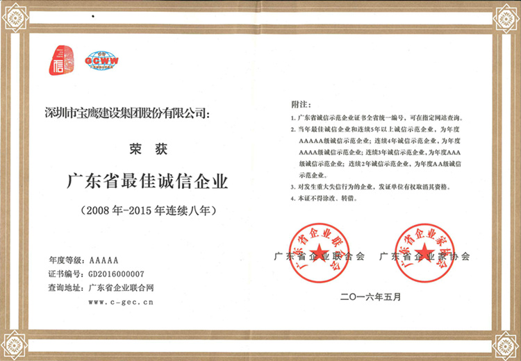 寶鷹集團(tuán)連續(xù)八年榮獲"廣東省最佳誠信企業(yè)”大獎