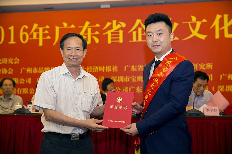 2016年廣東省企業(yè)文化建設(shè)大獎(jiǎng)?lì)C獎(jiǎng)現(xiàn)場(左:廣東省企業(yè)文化研究會會長田豐;右:文化品牌部總經(jīng)理董賓)