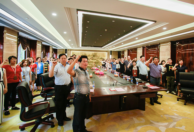 座談會由寶鷹集團黨支部成員、寶鷹股份董事長古少波主持。在莊嚴的國歌聲中,座談會正式開始。寶鷹集團黨支部書記、寶鷹集團董事局主席古少明帶領在場黨員重溫入黨誓詞。